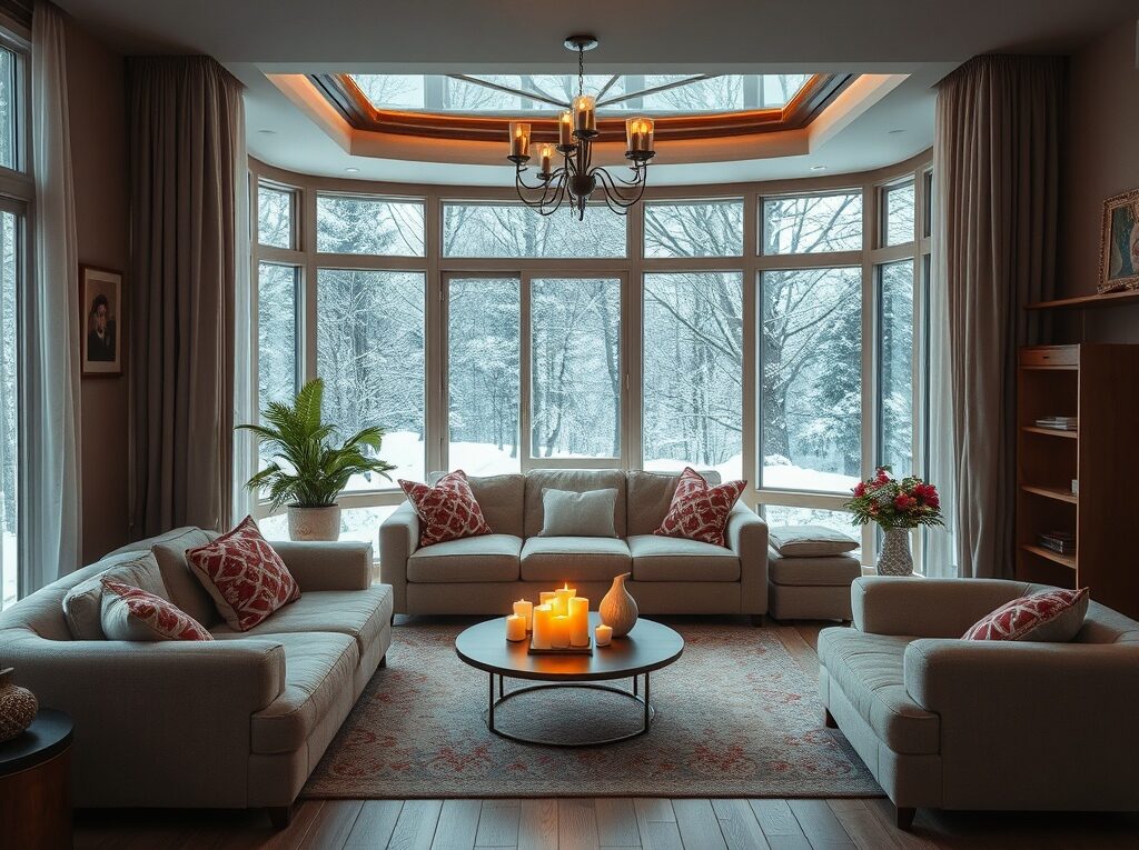 Уютная гостиная с большим окном, зимний пейзаж, мебель в классическом стиле, книги и уютный свет.